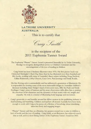 Booked Out is very proud of Craig Smith! He has been awarded the 2011 Euphemia Tanner Award. It is a biennial award presented by La Trobe University to recognise distinguished services to Children’s Literature and the encouragement of the joys of reading in children.